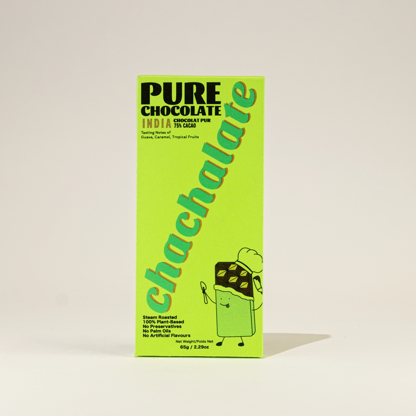 Meet Chachalate's India Pure 75% , where the cocoa beans used in this bar come from the Anamalai Farm in India, where the cacao grows amongst tall coconut and nutmeg trees. It is located near Pollachi, a region famous for its amazing coconuts. The beans are fermented in five tiers of wooden boxes and sun dried on raised beds.
