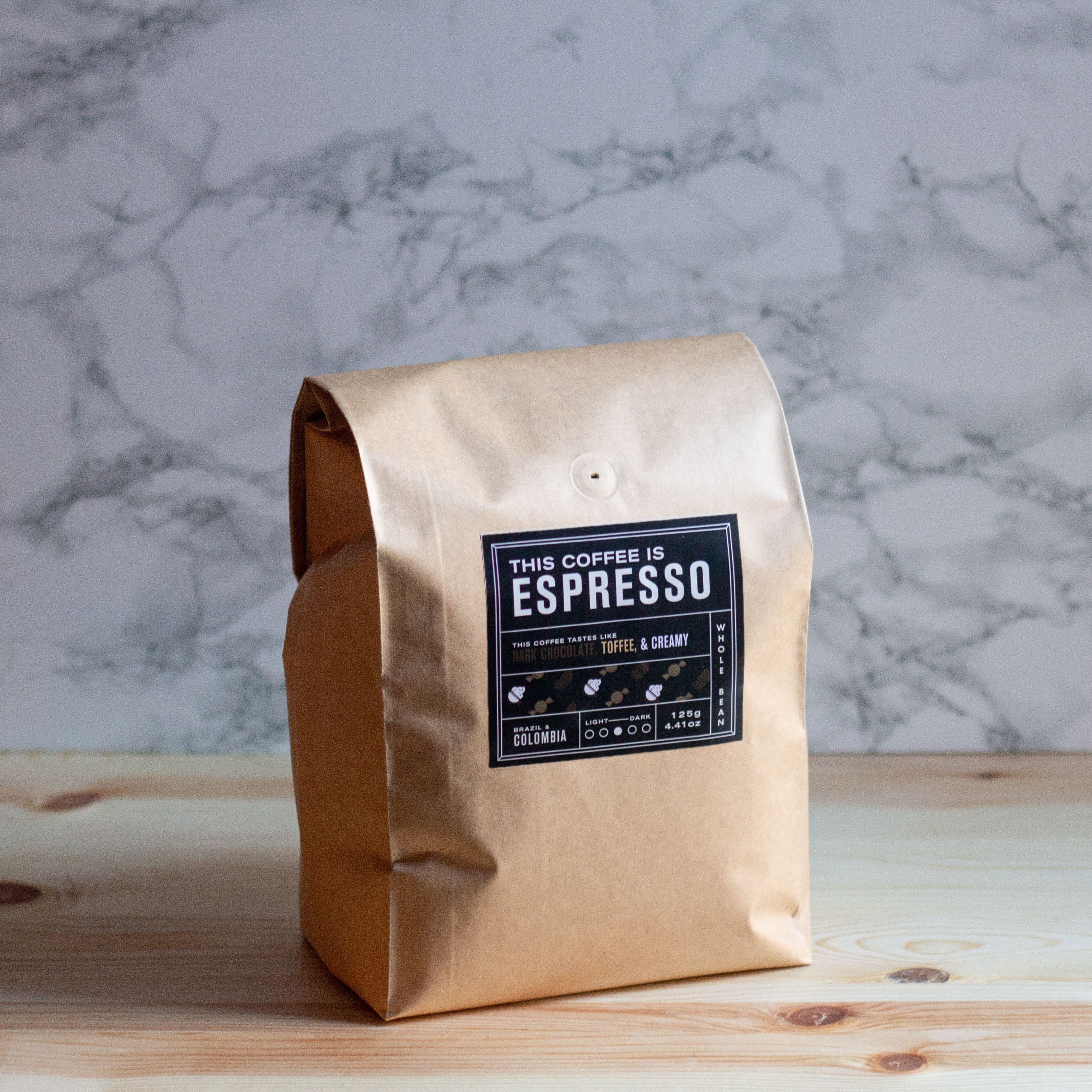 "A classic espresso! This Espresso tastes like chocolate, toffee, and works exceptionally with milk. Lattes that taste like a chocolate and toffee milkshake? Yes, please. This blend features two coffees: One from Cachoeira De Grama in Brazil and a Colombian from Huila."