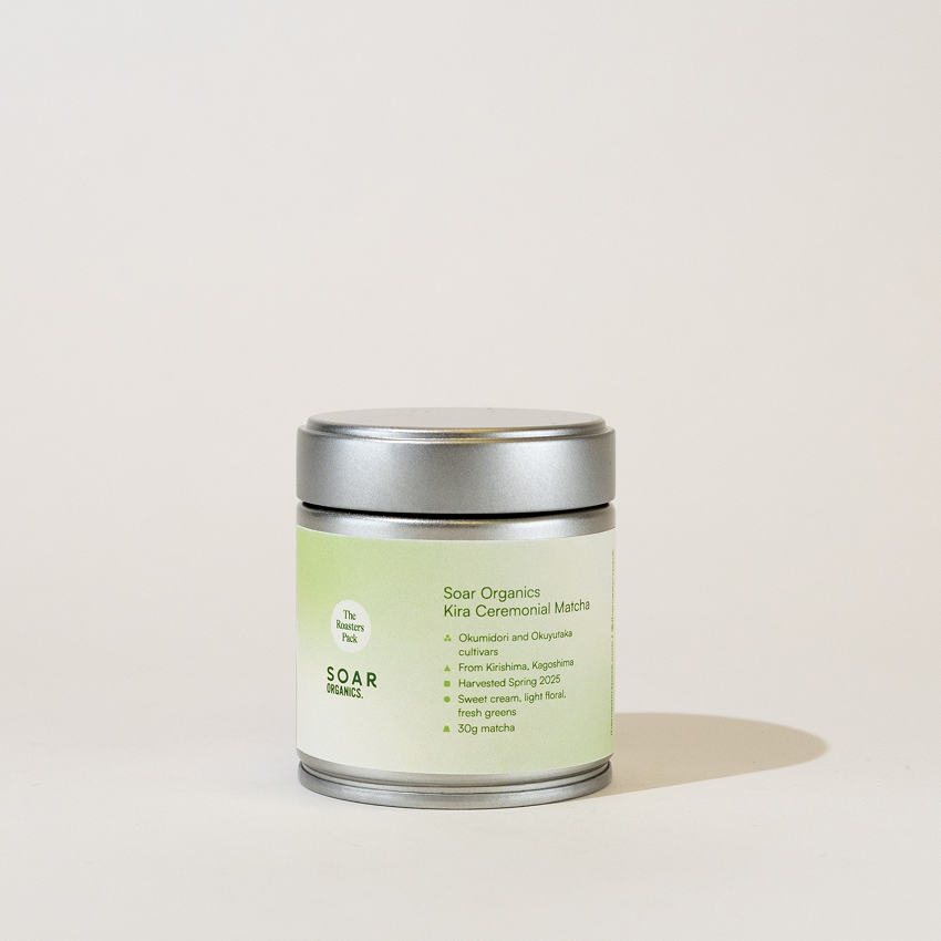 Meet Soar Organics' Kira Ceremonial Matcha. Harvested in early spring from the mineral-rich mountains of Kirishima, this matcha unites the delicate character of Okumidori with the savory depth of Okuyutaka. Gentle florals, round umami, and a naturally sweet, silky finish that speaks to its exceptional quality and terroir.