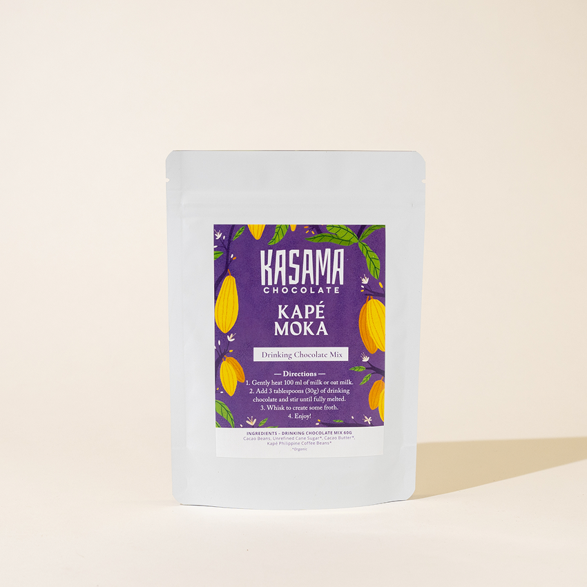 Meet Kasama's Kapé Moka Drinking Chocolate. A marriage of two very different beans, this drinking chocolate combines our in-house roasted cacao beans with coffee beans roasted by our friends Iona & Paolo of Kapé Coffee. This semi-washed coffee is grown in the highlands of Bansalan by award-winning coffee grower, Ate Marivic, part of a farmer owned co-operative in Davao del Sur.