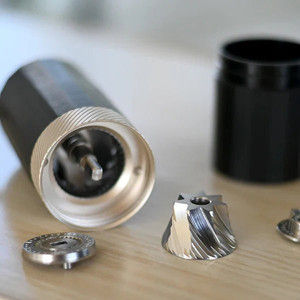 The 1Zpresso Q Air is the most portable manual coffee grinder from 1Zpresso. It is travel-sized with a grinding capacity of 15-18g of coffee. The Q Air also fits in the plunger of an Aeropress. This is an excellent introductory hand grinder for those that are new to coffee and for those of you who enjoy brewing while traveling.